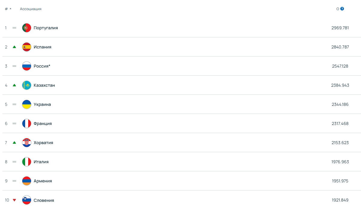 Қазіргі рейтингте көшбасшылықты Португалия құрамасы сақтап қалды. Еуропаның үздік футзал құрамалары төмендегідей орналасқан: