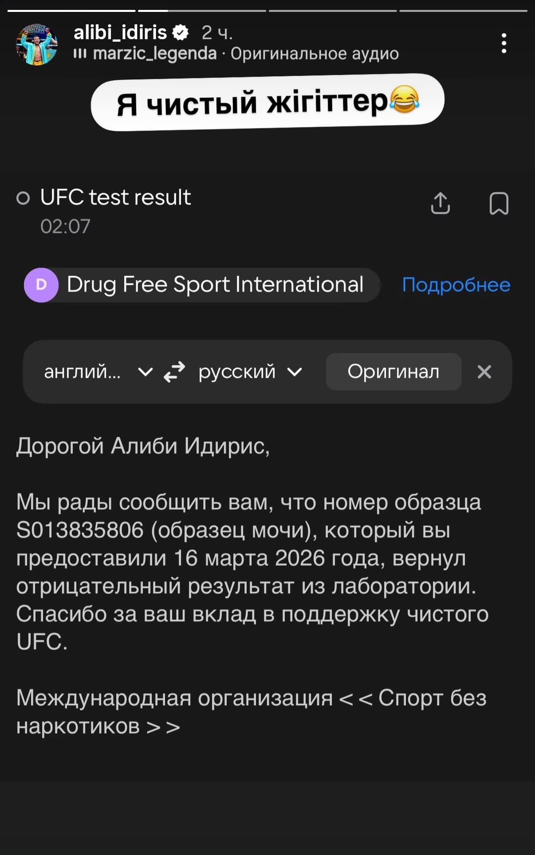 UFC-дің The Ultimate Fighter реалити-шоуына қатысқан алғашқы қазақстандық Instagram сторисінде қайта алынған допинг-сынаманың қорытындысын жариялады. Құжатқа сәйкес, бастапқы шешім расталмаған, ал оның талдауы тыйым салынған заттарға теріс нәтиже көрсеткен.