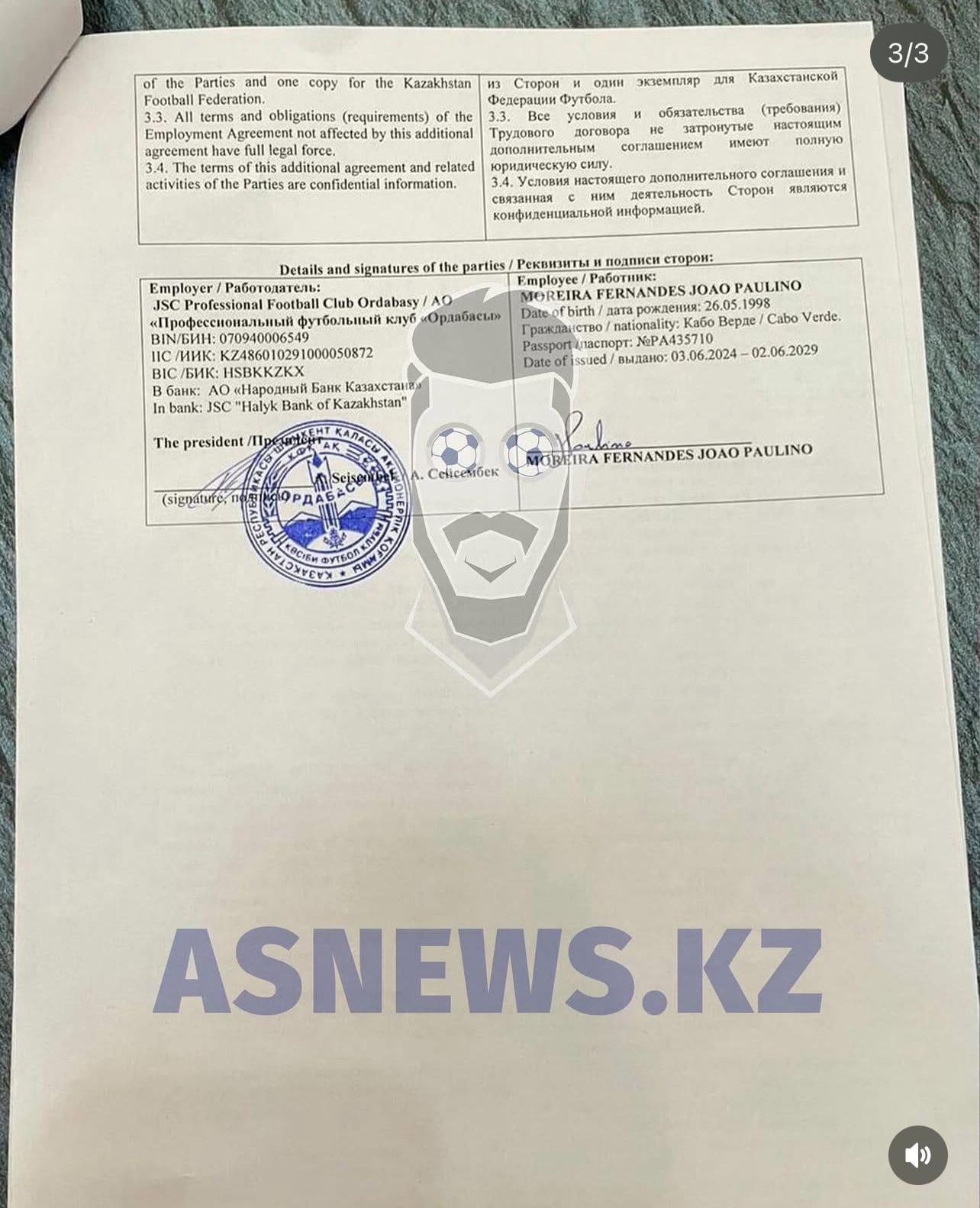 Келісімшарт 2025 жылдың 1 шілдесінде рәсімделген. Ол ағылшын және орыс тілінде, екі тараптың қолымен бекітілген. Яғни клуб президенті Асхат Сейсембек пен ойыншы Жоао Паулиньо қол қойған.