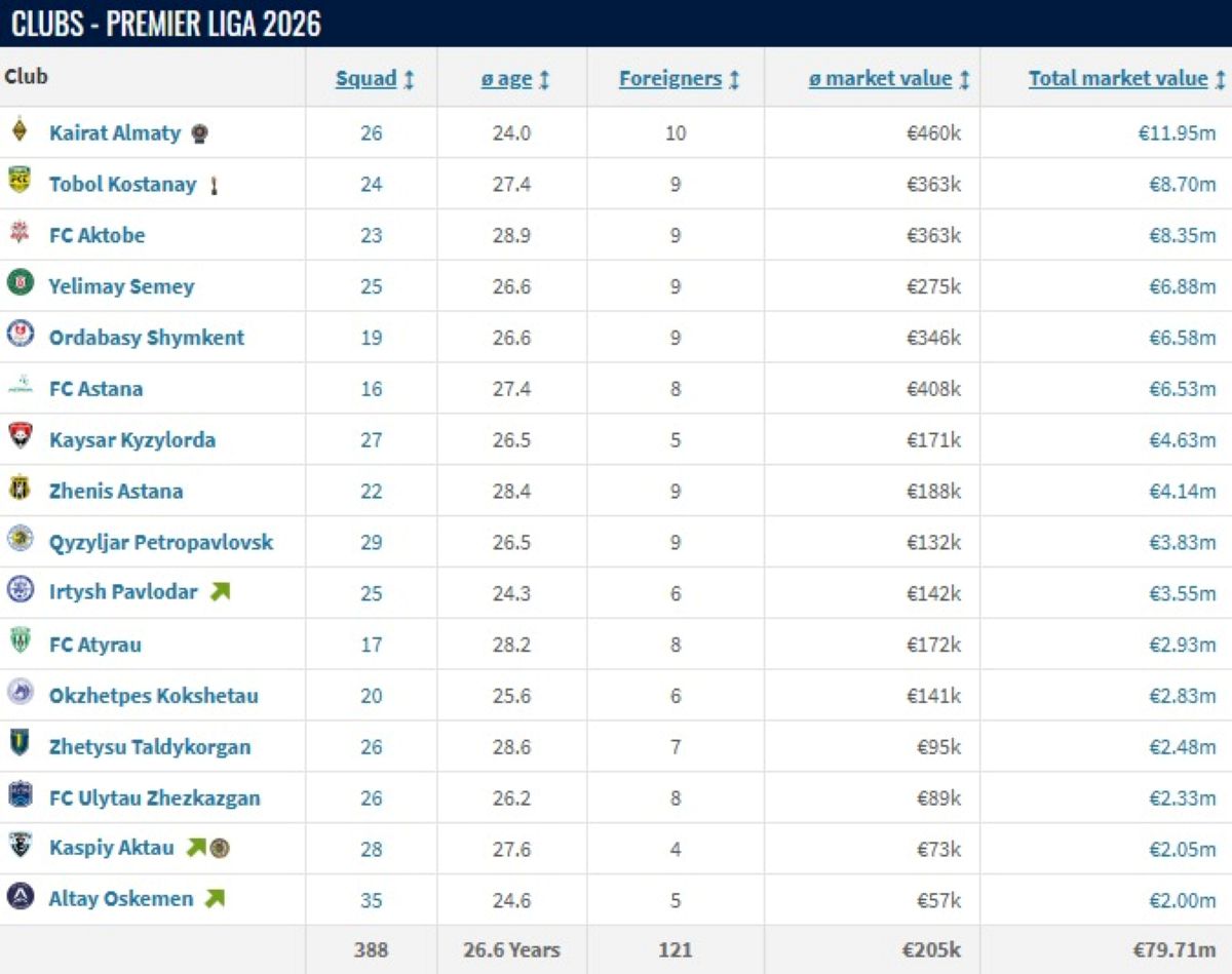 Қазақстан Премьер-лигасы-2026 маусымы қарсаңында клубтардың нарықтық құны жарияланды. Transfermarkt дерегіне сәйкес, ең қымбат құрам – алматылық "Қайратта", ал арзаны өскемендік "Алтайға" тиесілі.