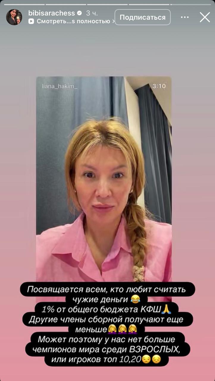 "Біреудің ақшасын санағанды жақсы көретіндерге арналады. Бұл – Қазақстан шахмат федерациясы бюджетінің бір пайызы ғана. Басқа құрама мүшелері бұдан да аз алады. Мүмкін, сондықтан бізде ересектер арасында әлем чемпиондары немесе топ-10, топ-20 ойыншылар аз шығар?" – деп жазды шахматшы.