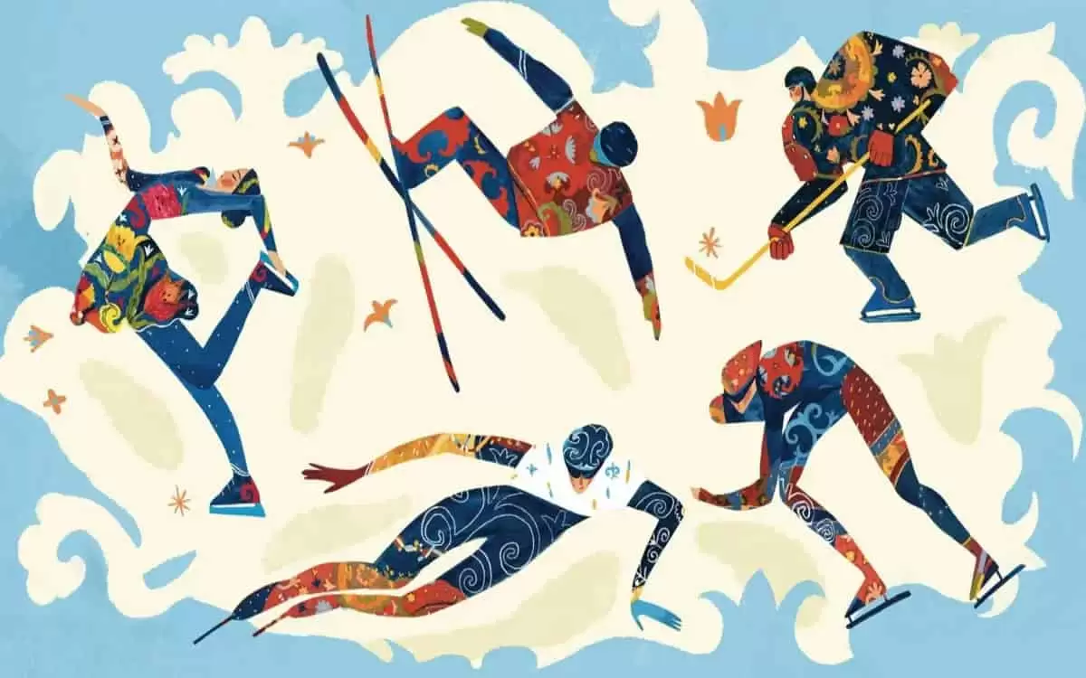 Иллюстрацияда қысқы спорт түрлері – шорт-трек, мәнерлеп сырғанау, хоккей, конькимен жүгіру және шаңғы спорты авторлық стильде бейнеленген. Жұмыс этно-модерн стилінде орындалып, ұлттық дәстүрлер мен заманауи өнер үйлесім тапқан.