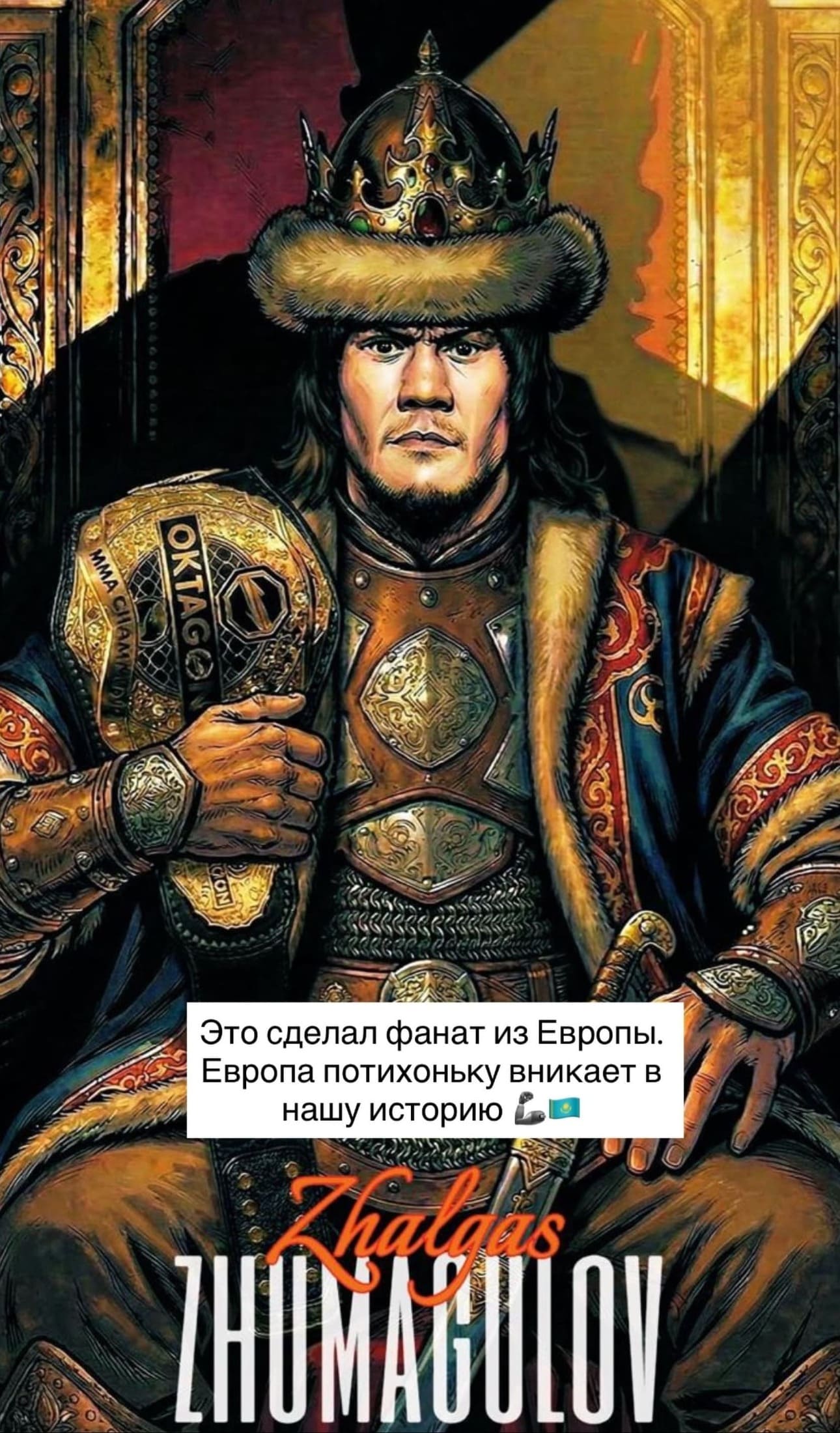 Жұмағұловтың сөзінше, оған ерекше плакат жолданған. Онда Жалғас хан кейпінде, ал қолында Oktagon чемпиондық белбеуі бейнеленген. Файтер бұл жұмысты Қазақстан тарихына деген қызығушылықтың белгісі деп қабылдағанын жеткізді.