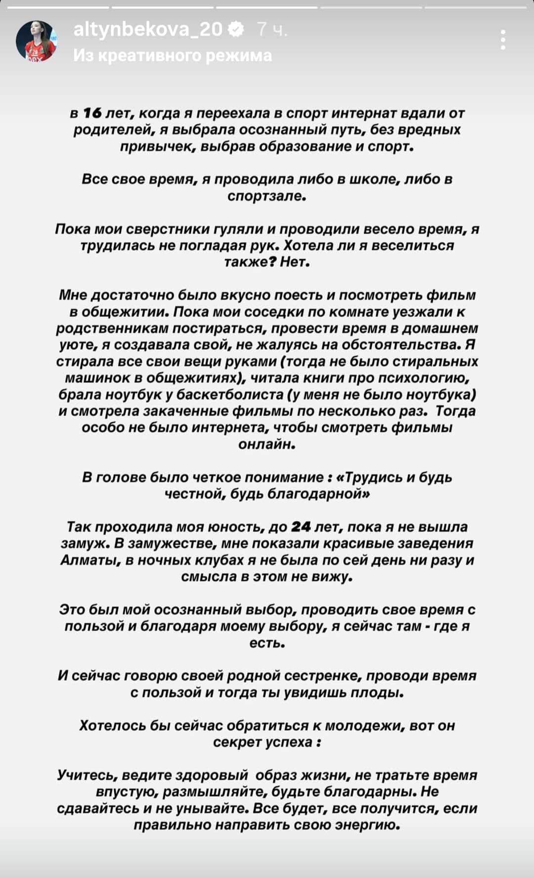 Алтынбекованың айтуынша, жастық шағы осылай өткен және 24 жасына дейін, яғни тұрмысқа шыққанға дейін осындай өмір салтын ұстанған.