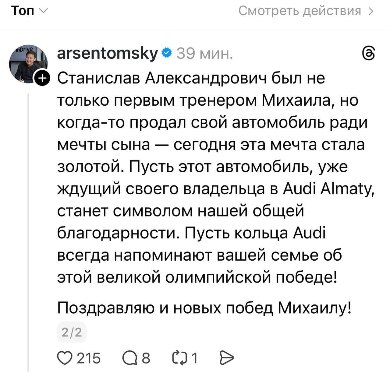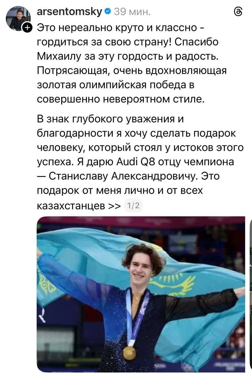 Ал inDrive компаниясының жетекшісі Арсен Томский тағы бір маңызды жаңалықты жариялады. Ол Михаилдың әкесі Станислав Шайдоровқа Audi Q8 тарту ететінін айтты.