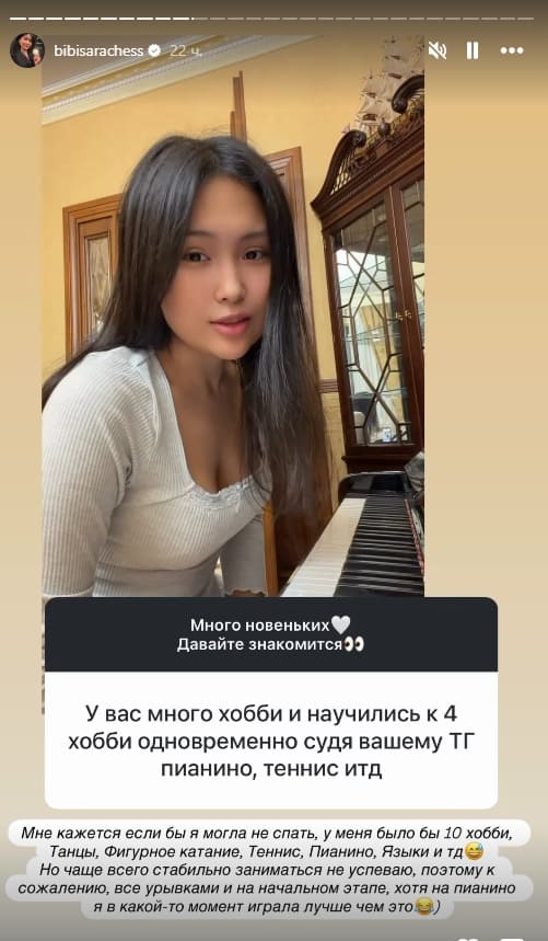 “Егер мен мүлде ұйықтамайтын адам болсам, онда менің он хоббиім болар еді. Би, мәнерлеп сырғанау, теннис, пианино, тілдер және тағы басқалары. Бірақ көбіне тұрақты түрде айналысуға үлгермеймін. Сондықтан, өкінішке қарай, бәрі үзік-үзік әрі бастапқы деңгейде қалып қояды. Дегенмен бір кезде пианинода қазіргіден жақсырақ ойнағанмын”, — деді Бибісара Асаубаева.