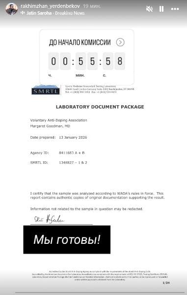 Ерденбеков Instagram Stories парақшасында VADA (Ерікті антидопингтік қауымдастық) өкілінен келген ресми хатты жариялады. Құжатта Әлімханұлынан алынған В сынамасы WADA ережелеріне толық сәйкес тексерілгені көрсетілген.